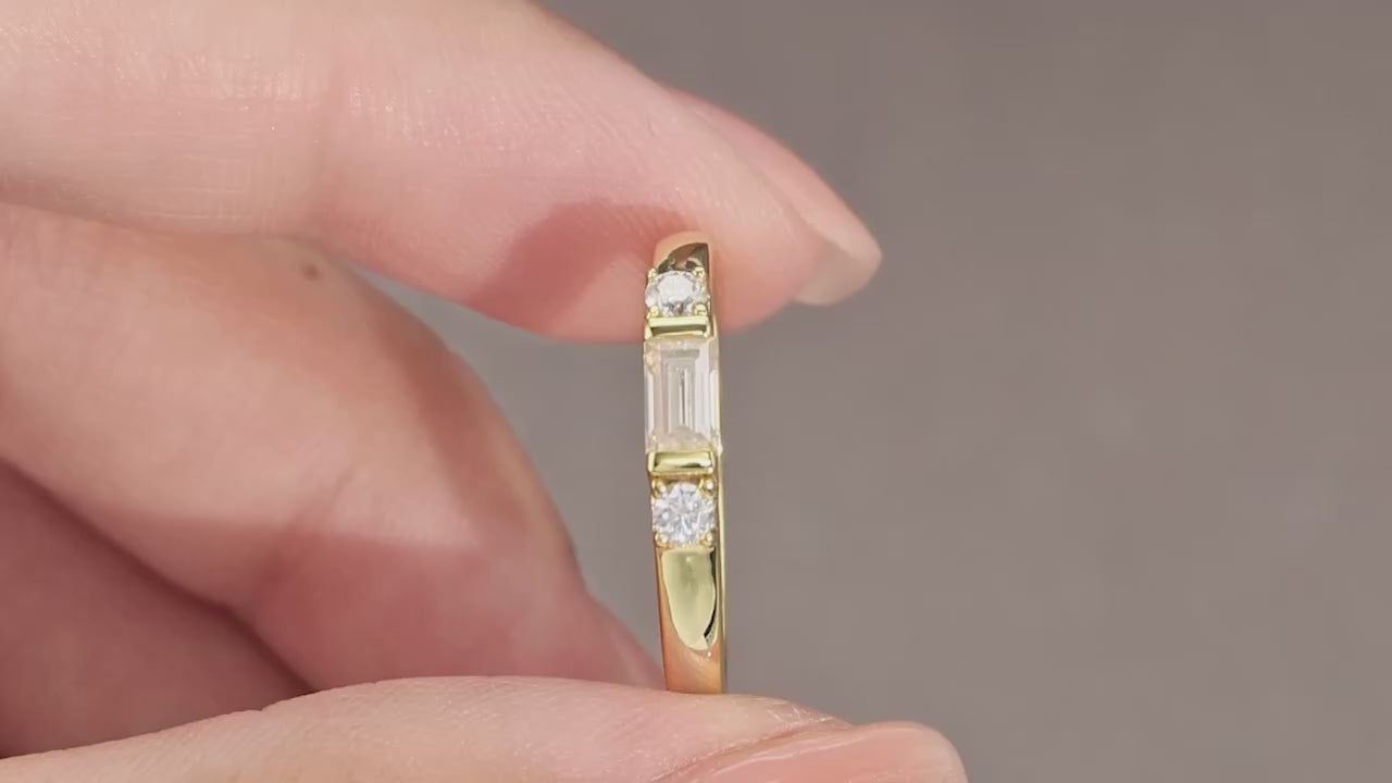 The Isolde Beam Ring offers affordable luxury for every girl, the petite luxury woman who shines in every moment. Crafted from 925 sterling silver with a lustrous gold-plated finish, this elegant band features a striking central rectangular-cut moissanite flanked by two round-cut accents for radiant sparkle. Its sleek design supports...